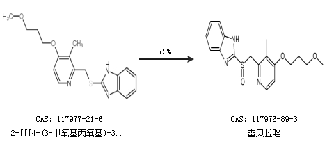 2.通过2-[[[4-(3-甲氧基丙氧基)-3-甲基吡啶-2-基]甲基]硫代]-1H-苯并咪唑合成雷贝拉唑,收率约75%;