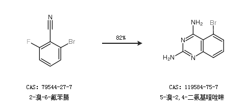 2.通过2-溴-6-氟苯腈合成5-溴-2,4-二氨基喹唑啉,收率约82%;