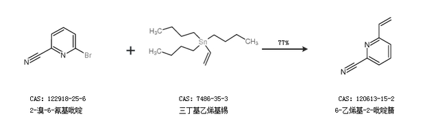 2.通过2-溴-6-氰基吡啶和三丁基乙烯基锡合成6-乙烯基-2-吡啶腈,收率约77%;