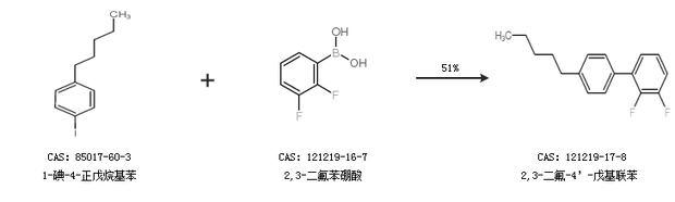 1.通过1-碘-4-正戊烷基苯和2,3-二氟苯硼酸合成2,3-二氟-4’-戊基联苯,收率约51%;