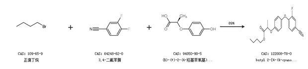 1.通过正溴丁烷、3,4-二氟苯腈和(R)-(+)-2-(4-羟基苯氧基)丙酸合成butyl 2-[4-(4-cyano-2-fluorophenoxy)phenoxy]propanoate,收率约89%;