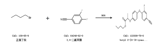 2.通过正溴丁烷和3,4-二氟苯腈合成butyl 2-[4-(4-cyano-2-fluorophenoxy)phenoxy]propanoate,收率约96%;