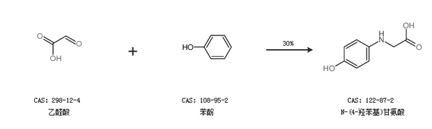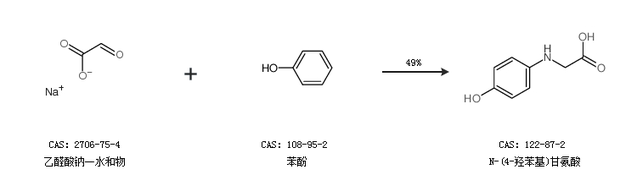 1.通过乙醛酸钠一水和物和苯酚合成N-(4-羟苯基)甘氨酸,收率约49%;