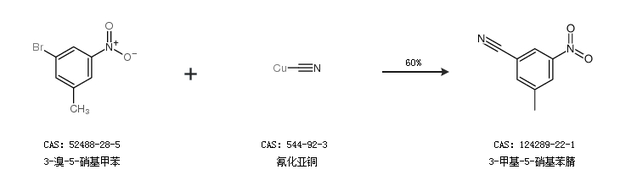 1.通过3-溴-5-硝基甲苯和氰化亚铜合成3-甲基-5-硝基苯腈,收率约60%;