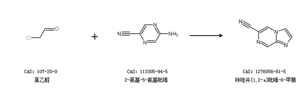 1.通过氯乙醛和2-氨基-5-氰基吡嗪合成咪唑并[1,2-a]吡嗪-6-甲腈