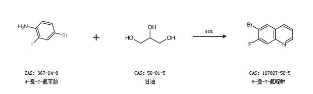 2.通过4-溴-2-氟苯胺和甘油合成6-溴-7-氟喹啉,收率约44%;