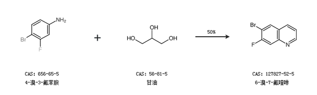 1.通过4-溴-3-氟苯胺和甘油合成6-溴-7-氟喹啉,收率约50%;