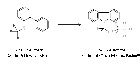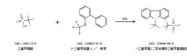 1.通过三氟甲磺酸和2-三氟甲硫基-1,1’-联苯合成S-(三氟甲基)二苯并噻吩三氟甲基磺酸盐,收率约83%;