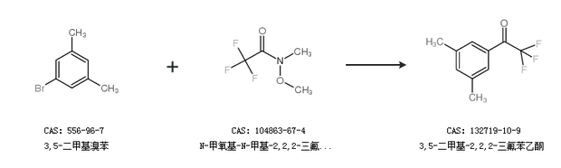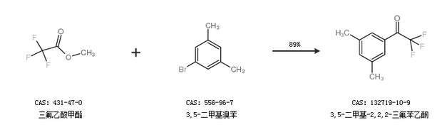 1.通过三氟乙酸甲酯和3,5-二甲基溴苯合成3,5-二甲基-2,2,2-三氟苯乙酮,收率约89%;