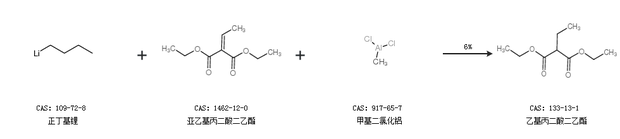 1.通过正丁基锂、亚乙基丙二酸二乙酯和甲基二氯化铝合成乙基丙二酸二乙酯,收率约6%;