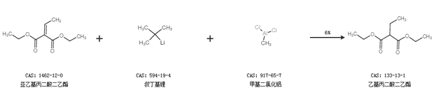 2.通过亚乙基丙二酸二乙酯、叔丁基锂和甲基二氯化铝合成乙基丙二酸二乙酯,收率约6%;