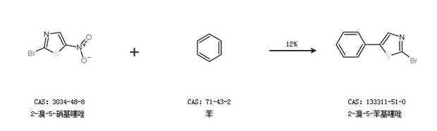 2.通过2-溴-5-硝基噻唑和苯合成2-溴-5-苯基噻唑,收率约12%;