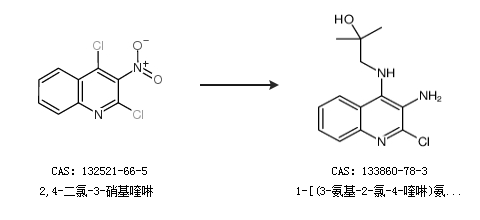 1.通过2,4-二氯-3-硝基喹啉合成1-[(3-氨基-2-氯-4-喹啉)氨基]-2-甲基-2-丙醇