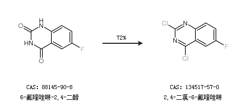 1.通过6-氟喹唑啉-2,4-二醇合成2,4-二氯-6-氟喹唑啉,收率约72%;