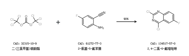 2.通过二(三氯甲基)碳酸酯和2-氨基-5-氟苯腈合成2,4-二氯-6-氟喹唑啉,收率约90%;