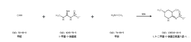 1.通过甲醛、1-甲基-3-硝基胍和甲胺合成1,5-二甲基-2-硝基亚氨基六氢-1,3,5-三嗪,收率约95%;