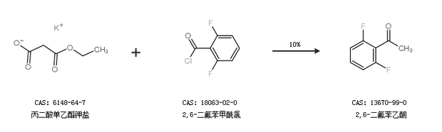 1.通过丙二酸单乙酯钾盐和2,6-二氟苯甲酰氯合成2,6-二氟苯乙酮,收率约10%;