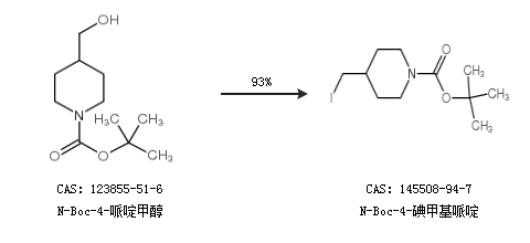 1.通过N-Boc-4-哌啶甲醇合成N-Boc-4-碘甲基哌啶,收率约93%;