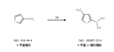 2.通过3-甲基噻吩合成4-甲基-2-噻吩硼酸,收率约2%;