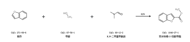 1.通过氧茚、甲醇和N,N-二甲基甲酰胺合成苯并呋喃-2-羧酸甲酯,收率约62%;
