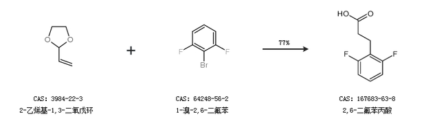 1.通过2-乙烯基-1,3-二氧戊环和1-溴-2,6-二氟苯合成2,6-二氟苯丙酸,收率约77%;