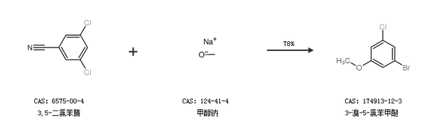 2.通过3,5-二氯苯腈和甲醇钠合成3-溴-5-氯苯甲醚,收率约78%;