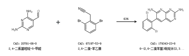 1.通过2,4-二氨基嘧啶-5-甲醛和2,6-二溴-苯乙腈合成6-(2,6-二溴苯基)吡啶并[2,3-d]嘧啶-2,7-二胺,收率约63%;