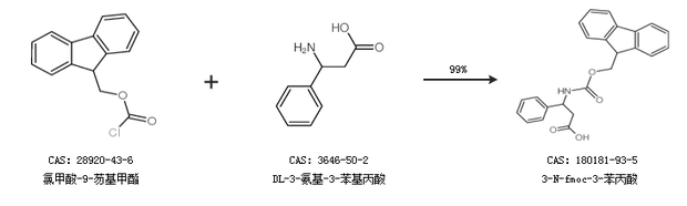 1.通过氯甲酸-9-芴基甲酯和DL-3-氨基-3-苯基丙酸合成3-N-fmoc-3-苯丙酸,收率约99%;