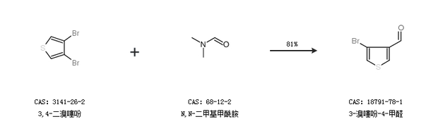 1.通过3,4-二溴噻吩和N,N-二甲基甲酰胺合成3-溴噻吩-4-甲醛,收率约81%;