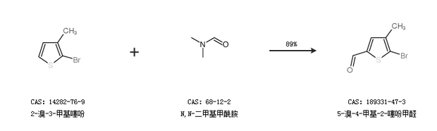 1.通过2-溴-3-甲基噻吩和N,N-二甲基甲酰胺合成5-溴-4-甲基-2-噻吩甲醛,收率约89%;