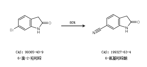 1.通过6-溴-2-羟吲哚合成6-氰基吲哚酮,收率约80%;