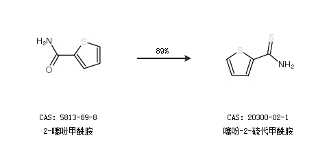 1.通过2-噻吩甲酰胺合成噻吩-2-硫代甲酰胺,收率约89%;