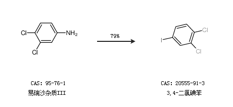 1.通过易瑞沙杂质III合成3,4-二氯碘苯,收率约79%;