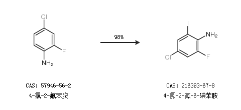 1.通过4-氯-2-氟苯胺合成4-氯-2-氟-6-碘苯胺,收率约98%;