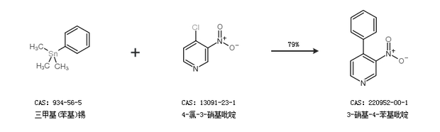 1.通过三甲基(苯基)锡和4-氯-3-硝基吡啶合成3-硝基-4-苯基吡啶,收率约79%;