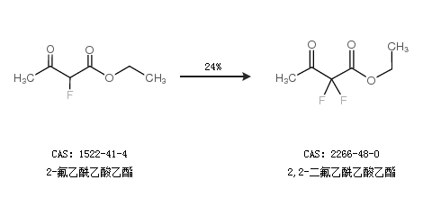 1.通过2-氟乙酰乙酸乙酯合成2,2-二氟乙酰乙酸乙酯,收率约24%;