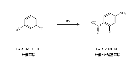 1.通过3-氟苯胺合成3-氟-4-硝基苯胺,收率约34%;