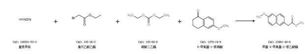 2.通过重氮甲烷、溴代乙酸乙酯、碳酸二乙酯和6-甲氧基-1-萘满酮合成甲基 6-甲氧基-2-萘乙酸酯