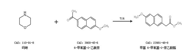 1.通过吗啉和6-甲氧基-2-乙酰萘合成甲基 6-甲氧基-2-萘乙酸酯,收率约71%;