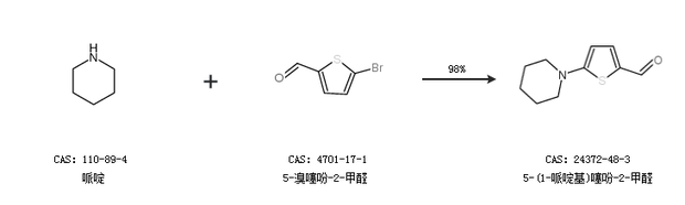 1.通过哌啶和5-溴噻吩-2-甲醛合成5-(1-哌啶基)噻吩-2-甲醛,收率约98%;