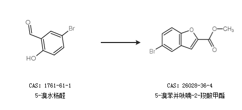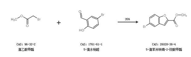 1.通过溴乙酸甲酯和5-溴水杨醛合成5-溴苯并呋喃-2-羧酸甲酯,收率约35%;
