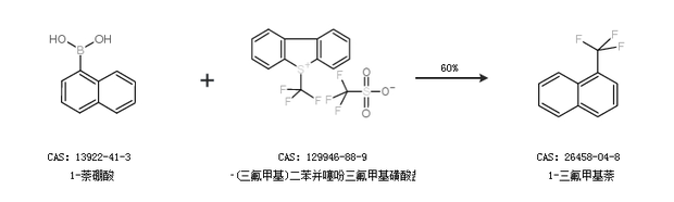 1.通过1-萘硼酸和S-(三氟甲基)二苯并噻吩三氟甲基磺酸盐合成1-三氟甲基萘,收率约60%;