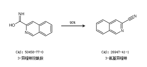 1.通过3-异喹啉羧酰胺合成3-氰基异喹啉,收率约90%;