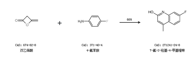 1.通过双乙烯酮和4-氟苯胺合成7-氟-2-羟基-4-甲基喹啉,收率约66%;