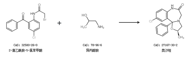 1.通过2-溴乙酰胺-5-氯苯甲酮和异丙醇胺合成奥沙唑