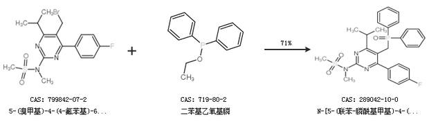 1.通过5-(溴甲基)-4-(4-氟苯基)-6-异丙基-2-[甲基(甲磺酰)氨基]嘧啶和二苯基乙氧基膦合成N-[5-(联苯-膦酰基甲基)-4-(4-氟-苯基)-6-异丙基-嘧啶-2-基]-N-甲基-甲烷磺胺,收率约71%;
