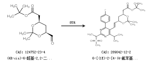 1.通过(4R-cis)-6-醛基-2,2-二甲基-1,3-二氧己环-4-乙酸叔丁酯合成6-[(1E)-2-[4-(4-氟苯基)-6-异丙基-2-[甲基(甲磺酰)氨基]-5-嘧啶]乙烯基]-2,2-二甲基-1,3-二氧六环-4-乙酸叔丁酯,收率约85%;