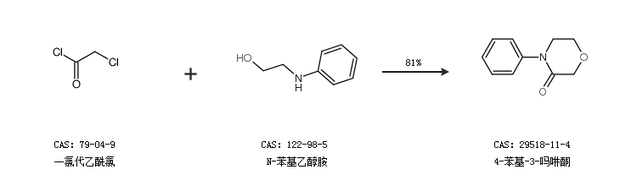 1.通过一氯代乙酰氯和N-苯基乙醇胺合成4-苯基-3-吗啉酮,收率约81%;