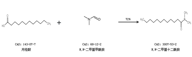 2.通过月桂酸和N,N-二甲基甲酰胺合成N,N-二甲基十二酰胺,收率约72%;