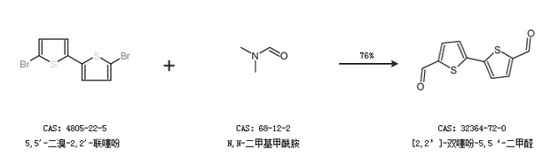 1.通过5,5''-二溴-2,2''-联噻吩和N,N-二甲基甲酰胺合成[2,2’]-双噻吩-5,5‘-二甲醛,收率约76%;